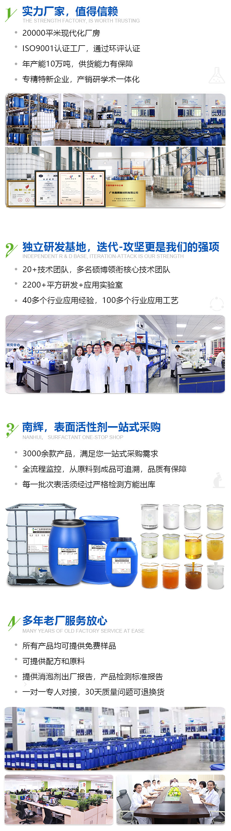 廣東南輝新材料有限公司,是一家致力于表面活性劑研發(fā)、生產(chǎn)、銷售為一體的國(guó)家高新技術(shù)企業(yè),擁有獨(dú)立的研發(fā)基地,主要研發(fā)產(chǎn)品有:乳化劑、滲透劑、勻染劑、司盤、吐溫、消泡劑等3000余款產(chǎn)品。南輝擁有20000平方米的現(xiàn)代化生產(chǎn)車間,年產(chǎn)能可達(dá)10萬(wàn)噸。通過ISO9001:2015質(zhì)量管理體系認(rèn)證,已獲得十余項(xiàng)不同產(chǎn)品的發(fā)明專利授權(quán),被評(píng)為廣東省"專精特新"企業(yè)。從2018年開始批量出口至俄羅斯、日本、馬來西亞、印度、秘魯?shù)葒?guó)家,已成為國(guó)內(nèi)目前主要的表面活性劑生產(chǎn)廠家。